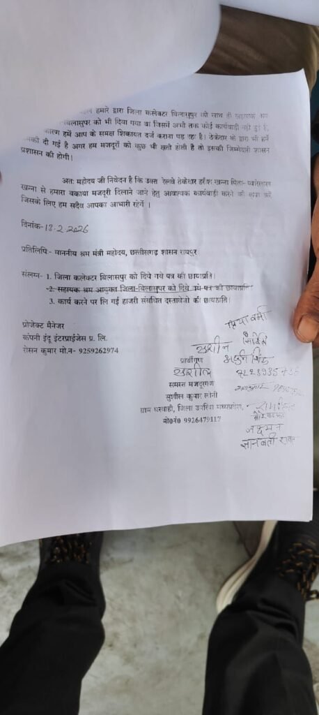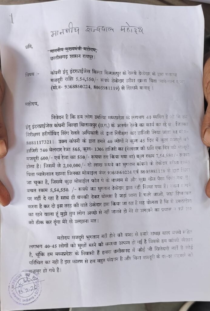 बिलासपुर:– इंदू इंटरप्राईजेस के तहत बिल्हा क्षेत्र में रेलवे कार्य कर रहे मध्यप्रदेश के लगभग 40 श्रमिकों ने अपनी बकाया मजदूरी को लेकर जिला प्रशासन से न्याय की गुहार लगाई है। श्रमिकों का आरोप है कि ठेकेदार हरीश खन्ना द्वारा 5,54,550 रुपये की मजदूरी का भुगतान अब तक नहीं किया गया है।