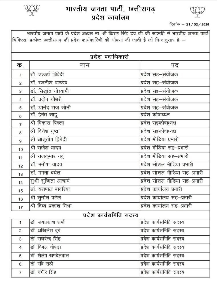 छत्तीसगढ़:–प्रदेश के प्रतिष्ठित होम्योपैथिक चिकित्सक, समाजसेवी एवं युवा नेतृत्वकर्ता डॉ. उत्कर्ष त्रिवेदी को भारतीय जनता पार्टी के चिकित्सा प्रकोष्ठ में...