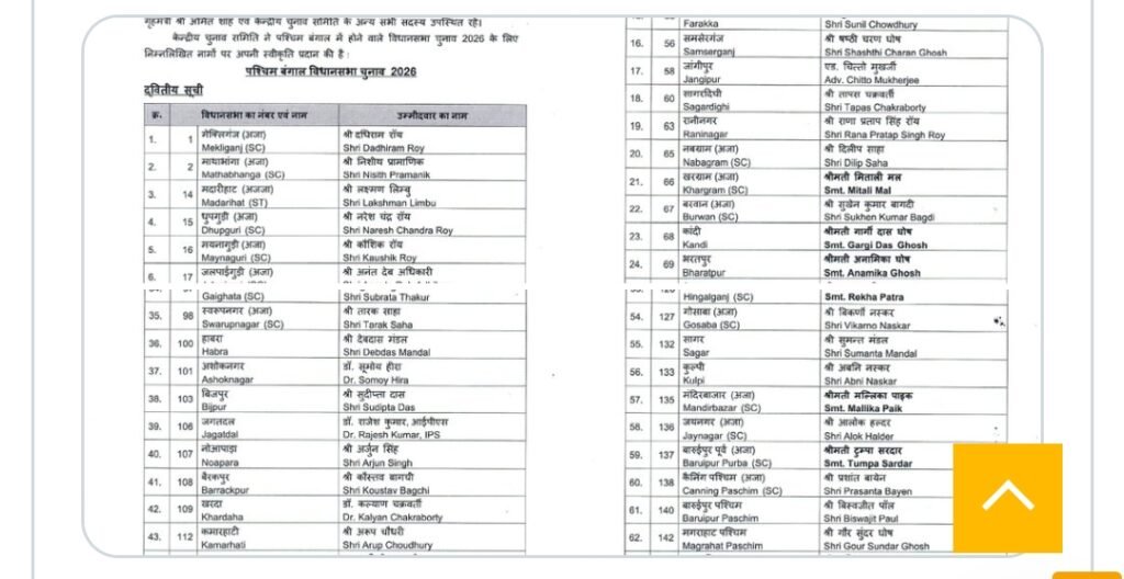 नई दिल्ली:– पश्चिम बंगाल विधानसभा चुनाव के लिए बीजेपी ने अपनी दूसरी लिस्ट जारी कर दी है। इस बार पार्टी ने कुल 111 उम्मीदवारों के नामों की घोषणा की है। इस लिस्ट को देखकर साफ लग रहा है कि पार्टी ने जीत के लिए पूरी जान झोंक दी है। लिस्ट में सिर्फ नेता ही नहीं, बल्कि नामी चेहरे, पूर्व सरकारी अधिकारी और बंगाली सिनेमा के सितारे भी शामिल हैं। बीजेपी का यह दांव बंगाल की सत्ता में सेंध लगाने की एक बड़ी कोशिश मानी जा रही है।