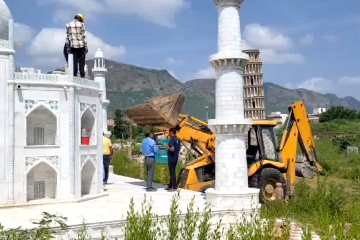 अजमेर:– अवैध निर्माण पर प्रदेश ही नहीं देश भर के कई राज्यों में लगातार कार्रवाई जारी है। अवैध निर्माण पर कार्रवाई के तहत ताजमहल पर बुलडोजर चलाया गया। बताया जा रहा है कि ताज महल सहित कई निर्माण को अवैध बताते हुए प्रशासन ने बुलडोजर चलवाया है, जो लगातार चौथे दिन जारी है। वहीं, कुछ मजदूर ऐसे भी लगाए गए हैं जो छीनी हथौड़ा लेकर ताजमहल के ऊपर चढ़ गए और उसे तोड़ रहे हैं। अतिक्रमण पर कार्रवाई के दौरान माहौल न गरमाए इसलिए भारी मात्रा में पुलिस बल की तैनाती भी की गई है।