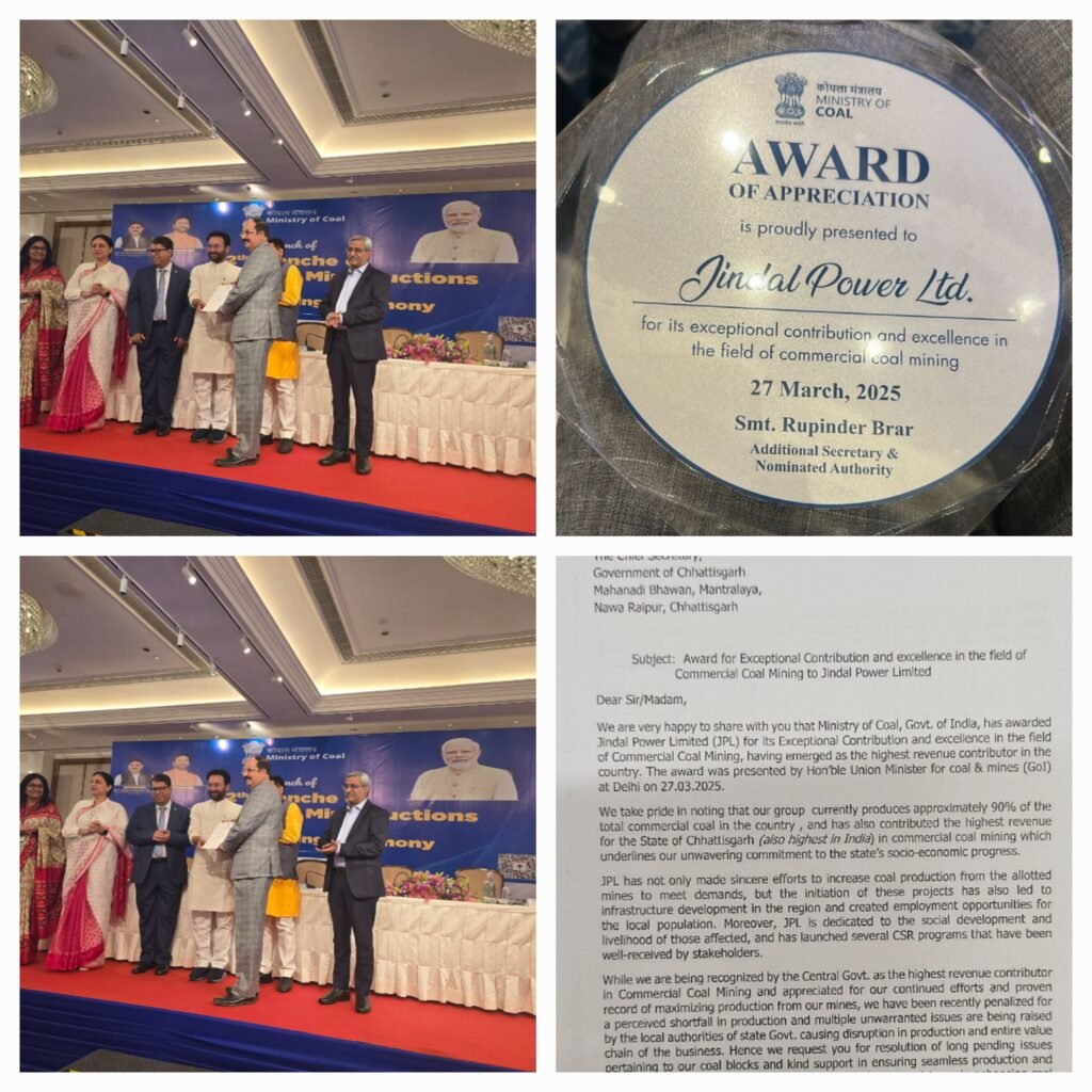 भारत सरकार के कोयला मंत्रालय ने वाणिज्यिक कोयला खनन क्षेत्र में असाधारण योगदान और उत्कृष्टता के लिए जिंदल पावर लिमिटेड को सम्मानित किया गया हैं।जो कि देश का लगभग 90%कमर्शियल उत्पादन वाणिज्य कोयले उत्पादन किया हैं,जो देश में सबसे अधिक राजस्व योगदान कर्ता के रूप में उभरा हैं,यह पुरस्कार दिल्ली में माननीय केंद्रीय कोयला और खनन मंत्री श्री किशन रेड्डी द्वारा प्रदान किया गया।