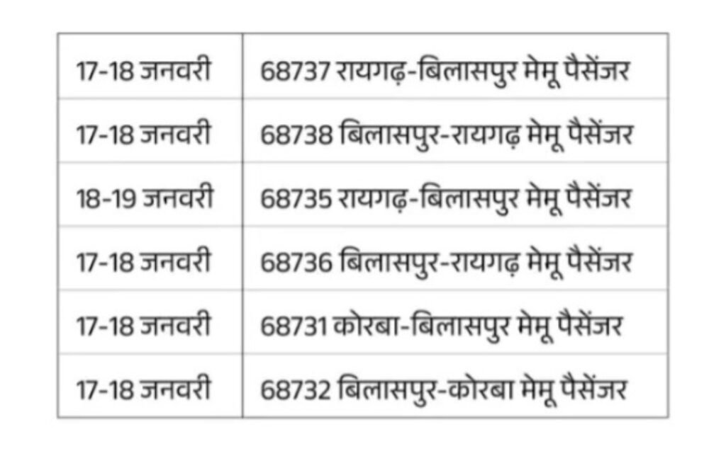 17 और 18 जनवरी को बिलासपुर-रायगढ़-बिलासपुर और बिलासपुर-कोरबा-बिलासपुर मेमू लोकल ट्रेन दो दिन नहीं चलेंगी। इसके चलते रोजाना ट्रेन में सफर करने वाले यात्रियों को मुसीबतों का सामना करना पड़ेगा।