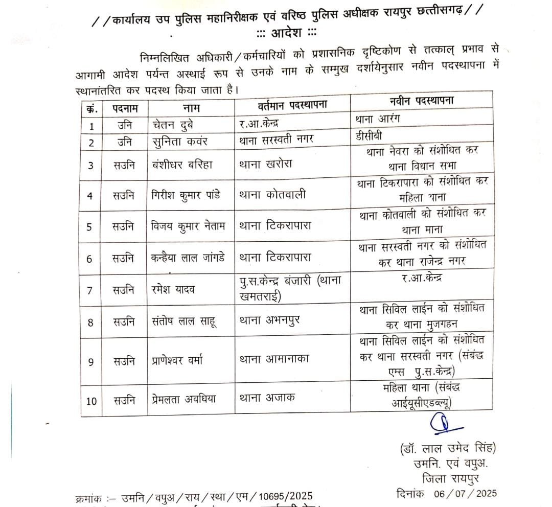 रायपुर। राजधानी रायपुर के पुलिस विभाग में वर्षों से जमी मनमानी की जड़ आखिरकार उखड़ गई। खमतराई थाना में लंबे समय से पदस्थ ASI रमेश यादव को वरिष्ठ पुलिस अधीक्षक (SSP) लाल उम्मेद सिंह ने तत्काल प्रभाव से हटा दिया। ASI पर आरोप था कि वह कई वर्षों से एक ही थाने में जमे हुए थे और अपने आप को उच्च अधिकारियों से सीधा संपर्क वाला बताकर रौब गांठते थे।