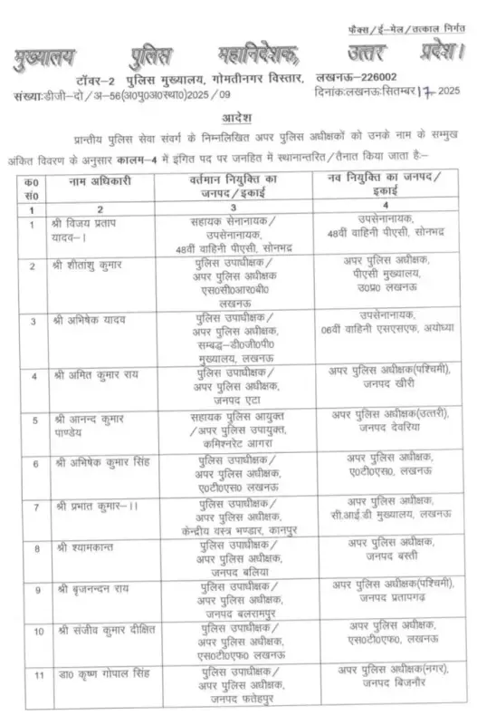 यूपी:– उत्तर प्रदेश में योगी आदित्यनाथ सरकार ने प्रशासनिक स्तर पर एक और बड़ा बदलाव किया है। आईएएस और आईपीएस अधिकारियों के बड़े पैमाने पर तबादलों के बाद अब 57 प्रोविंशियल पुलिस सर्विस पीपीएस अधिकारियों का तबादला आदेश जारी कर दिया गया है। इस फेरबदल में कई चर्चित नाम शामिल हैं, जो अपने बयानों और कार्यशैली के कारण सुर्खियों में छाए रहते हैं।